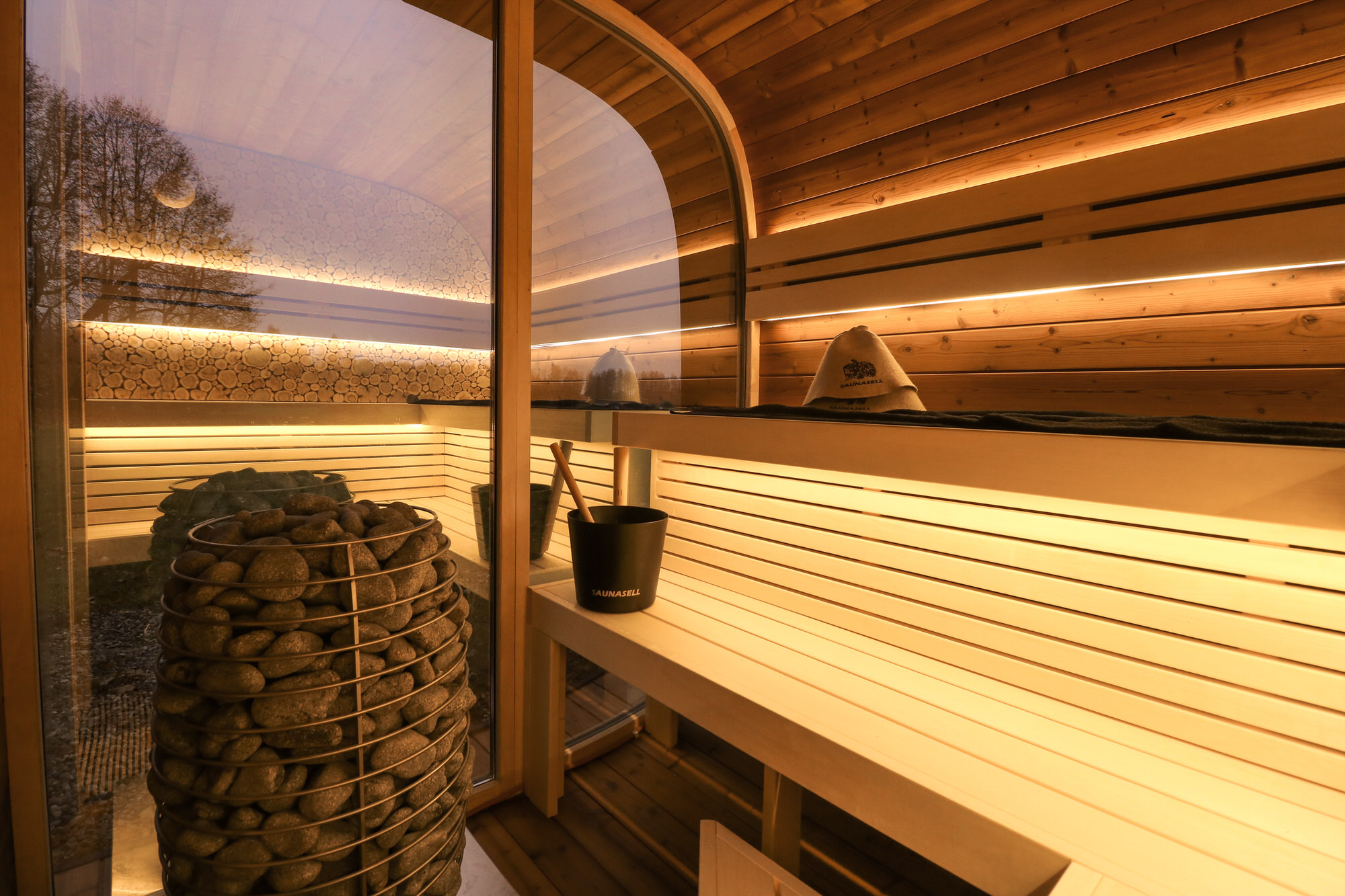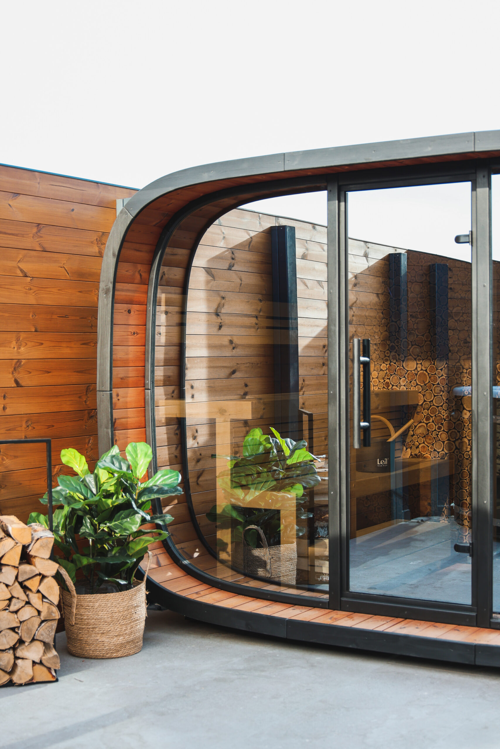 Round Cube® ist ein architektonisches Statement: Die charakteristische, geschwungene Silhouette, geschützt durch EUIPO-Designrechte, macht diese Sauna zu einem echten Blickfang – perfekt für Fincas, moderne Villen und Boutique-Hotels auf Mallorca. Außen umhüllt hochwertiges ThermoWood die Sauna mit natürlicher Eleganz, während die spiegelnde Glasfront sich harmonisch in deine Landschaft einfügt und die Umgebung im Design reflektiert. Diese Kombination aus Natur, Material und Licht schafft eine Atmosphäre, die im mediterranen Ambiente besonders kraftvoll wirkt.